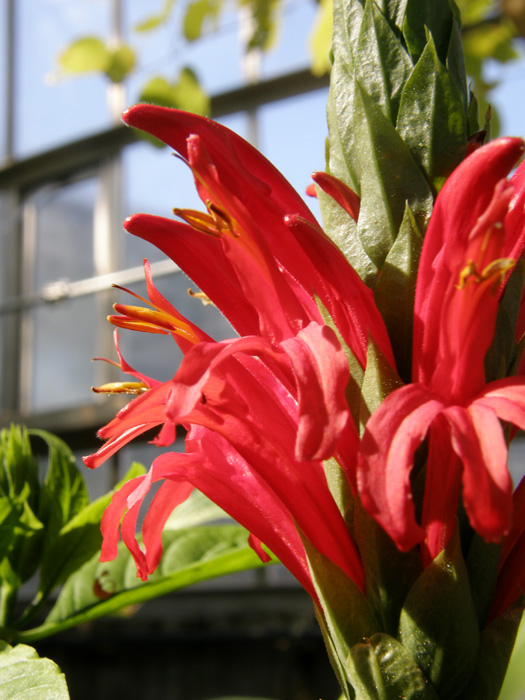| 形態 | 茎は直立し、よく分枝する。葉は光沢がある濃緑色で、先が尖った長楕円形で、対生する。5~11月頃、上部の葉腋に濃緑色の苞片が重なった花穂を作り、下から上に順に、苞片の間から真っ赤な筒状の花を咲かせる。 |