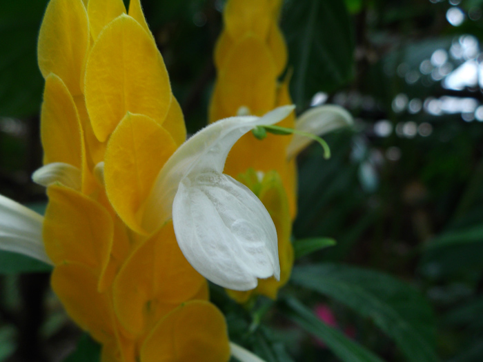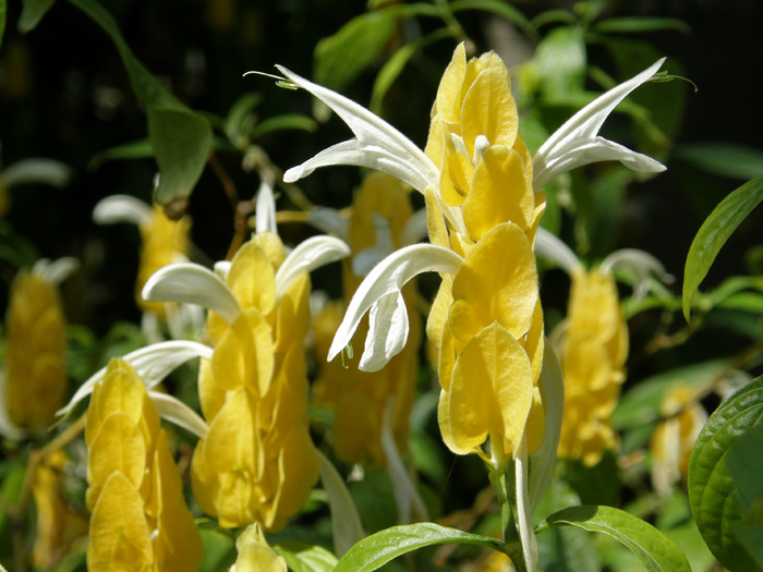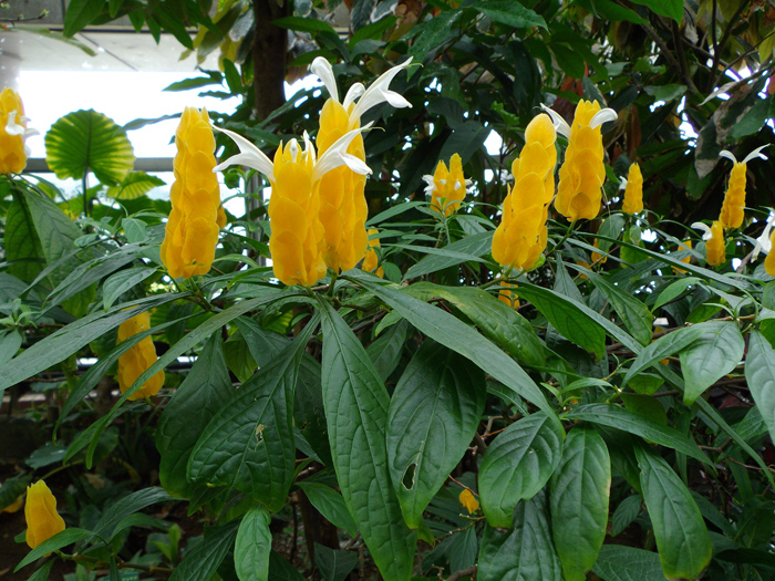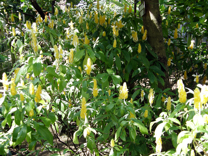 | 形態 | 茎は直立し、よく分枝する。葉は光沢がある濃緑色で、先が尖った長楕円形で、対生する。5~11月頃、上部の葉腋に濃黄色の苞片が四角錐状に重なった花穂を作り、下から上に順に、苞片の間から白い筒状の花を咲かせる。苞は長期間色あせない。 |