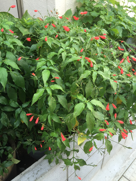 | 形態 | 基部はやや木質化し、よく分枝する。葉は先が尖った卵形で、対生する。5〜9月頃、葉腋から花序を出し、赤色の筒状花を咲かせる。温度さえあれば周年開花する。果実は蒴果。 |