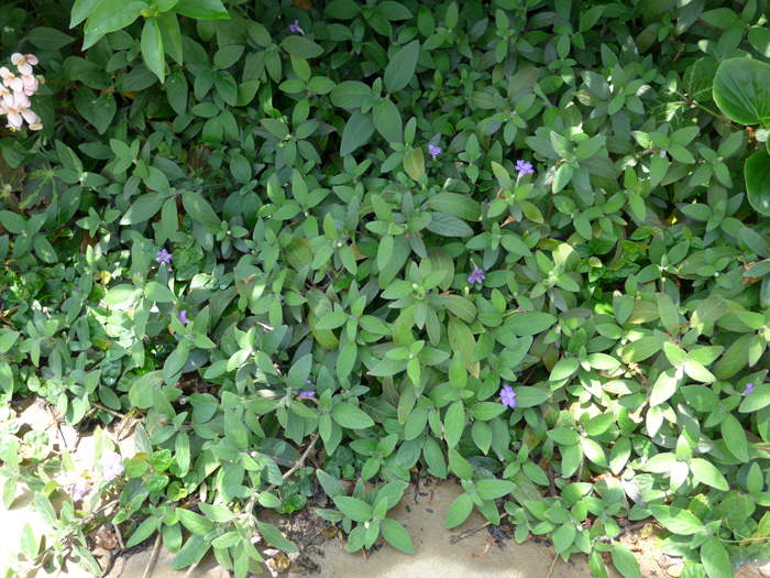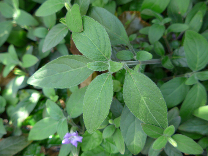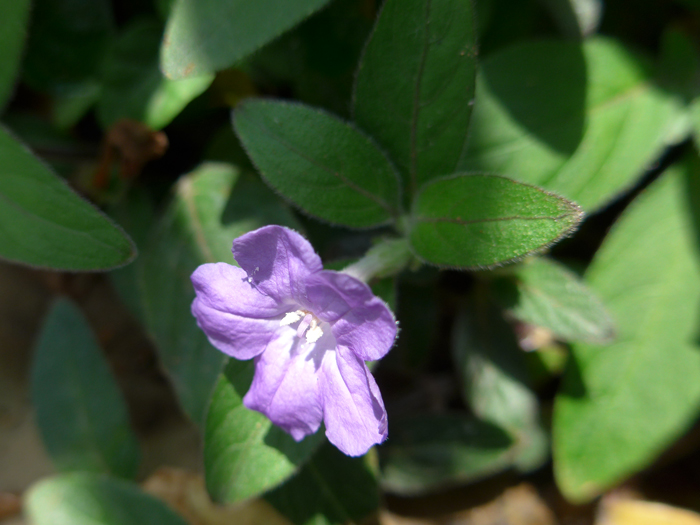 | 形態 | 茎の節から根を出し、匍匐して広がる。葉は先がやや尖った狭卵形で、全体が毛に覆われ、対生する。5〜12月頃、葉腋に紫色の一日花を咲かせる。花冠は5裂して平開する。果実は蒴果。 |
