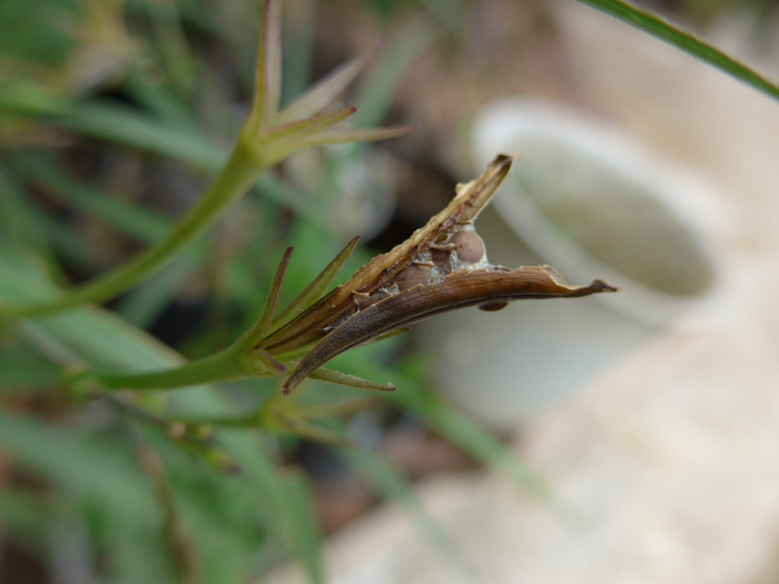 | 形態 | 多数の茎が地際から叢生して直立する。葉は細長く、緑色で紫色の葉脈が走り、浅い鋸歯があり、対生する。葉の幅はごく細いものからやや広いものまで変異がある。4~10月頃、葉腋から花茎を出してその先に紫色の一日花を咲かせる。花冠は5裂して平開し、花弁には多数の皺がある。果実は棒状の蒴果で、熟すと裂けて、円盤形で茶色の種子を出す。 |