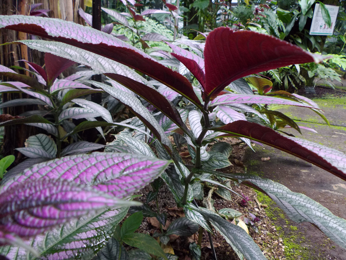 | 形態 | 茎は直立し、やや分枝する。葉は先が尖った長卵形〜長楕円形で、細かい鋸歯があり、対生する。葉の表面は暗緑色の地にメタリックな銀灰色〜赤紫色の斑が入り、裏面は暗赤紫色。12~翌3月頃、葉腋から穂状の花序を出し、紫色の筒状花を咲かせる。 |