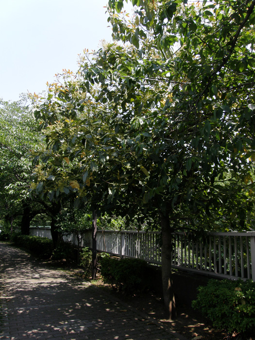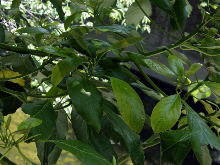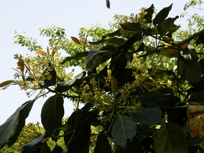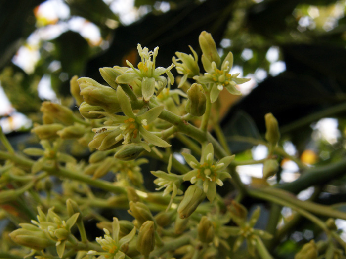 | 形態 | 葉は全縁で、先の尖った楕円形で、互生する。5月頃、枝先に円錐花序をつけ、淡い黄緑色の小さな花をたくさんつける。 花被片は6枚。花は雌しべと雄しべの成熟期が異なる雌雄異熟花で、午前受粉タイプと午後受粉タイプがあり、混植しないとほぼ結実はしない。花は多数咲かせるが結実はごくわずか。結実は11~12月頃。 |