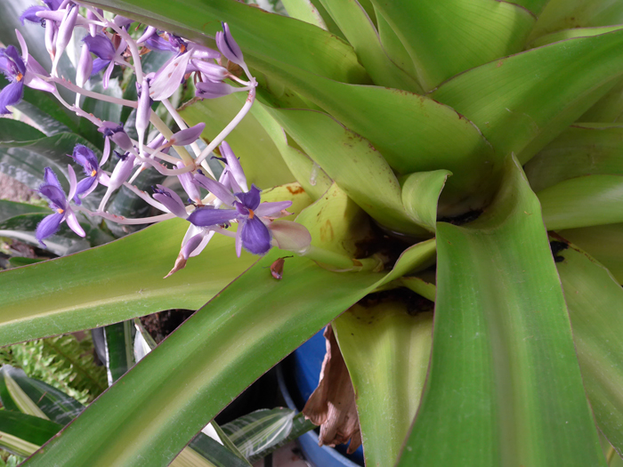 | 形態 | 樹上に着生して成長する。葉は光沢がある剣型で、ロゼット状になる。1〜3月頃、葉腋から花茎を伸ばして花序を作り、花を下方から上方へと順に咲かせる。花弁は3個で、紫青色〜濃紫青色で縁と表面は毛がたくさん生える。萼片は3個で、淡紫色。花には芳香がある。 |