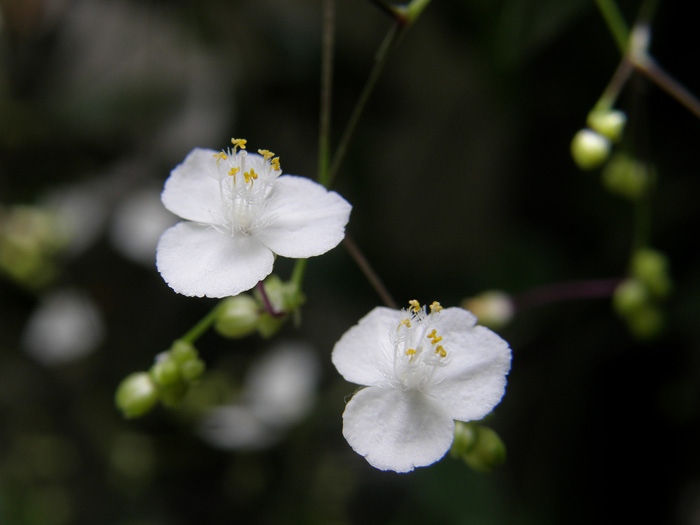 | 形態 | 茎は暗紫色でよく分枝して匍匐し、地についた節から発根して広がり、茎先は斜上する。葉は光沢のある暗緑色、裏は暗紫色で、先が尖った狭卵形で、互生する。原産地のものは葉が大きいが、栽培されているものは、葉身長2.5〜3cm程度にしかならない系統になる。春〜秋に枝先から細い花茎を出し、まばらに分枝した集散花序を作り、花弁が3個の白い花を10〜20個咲かせる。雄しべの花糸には白い毛が密生する。葯は黄色。 |