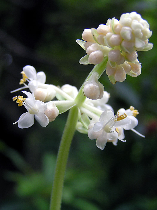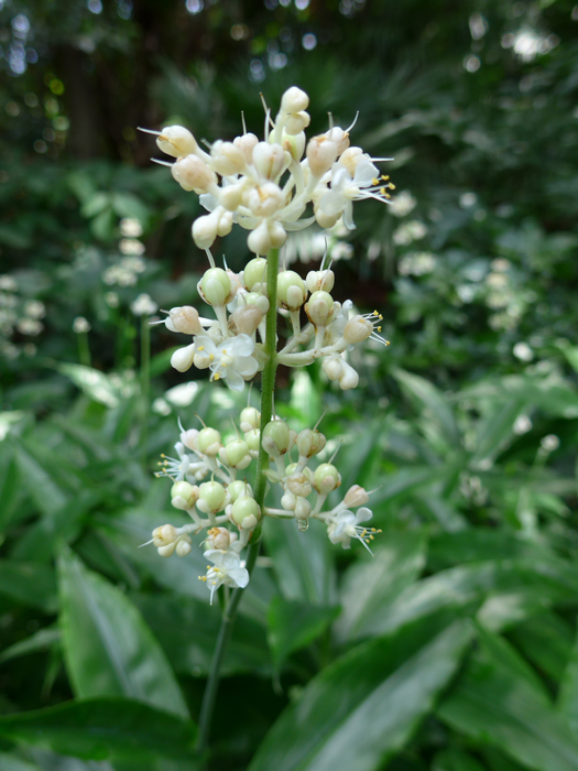 | 形態 | 細く白い地下茎が地中を這い、株が広がる。茎は直立する。葉は光沢のある緑色で、先が尖った狭楕円形で、基部は茎を抱き、螺旋状に互生する。7~9月頃、花茎を伸ばし、白い花を輪生状に数段に咲かせる。花は両性花と雄花が混ざって咲き、萼片が3個、花弁が3個で、ほぼ同色だが、花弁は1日でしぼみ、萼片は長く残る。果実は球形の液果で青藍色に熟す。 |