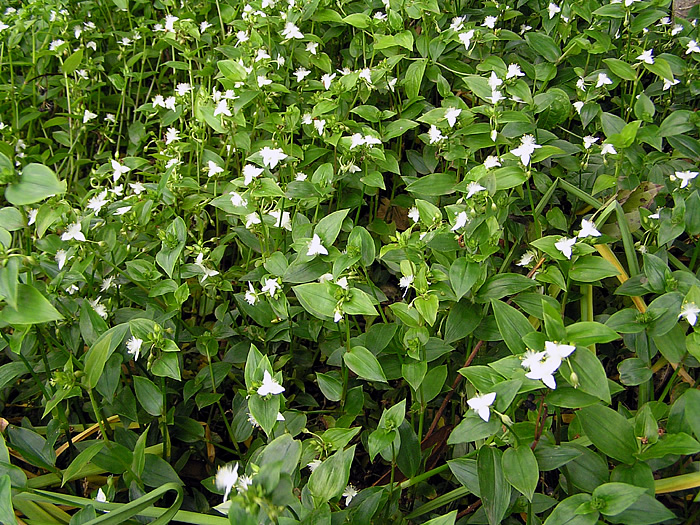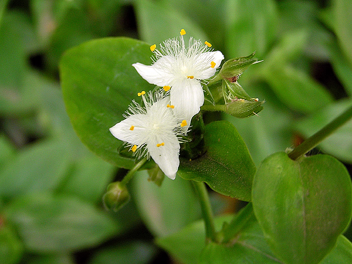 | 形態 | 茎は緑色でよく分枝して匍匐し、地についた節から発根して広がり、茎先は斜上する。葉は光沢のある緑色、裏はやや薄い緑色で、先が尖った長卵形で、互生する。葉の基部は茎を抱き、毛がある。春〜秋に枝先の2枚の苞の間に花序を作り、花弁が3個の白い花を5〜10個咲かせる。雄しべの花糸には白い毛が密生する。葯は黄色。花柄は細く暗紫色、蕾(萼)は緑色で、白い毛が生える。結実はしない。 |