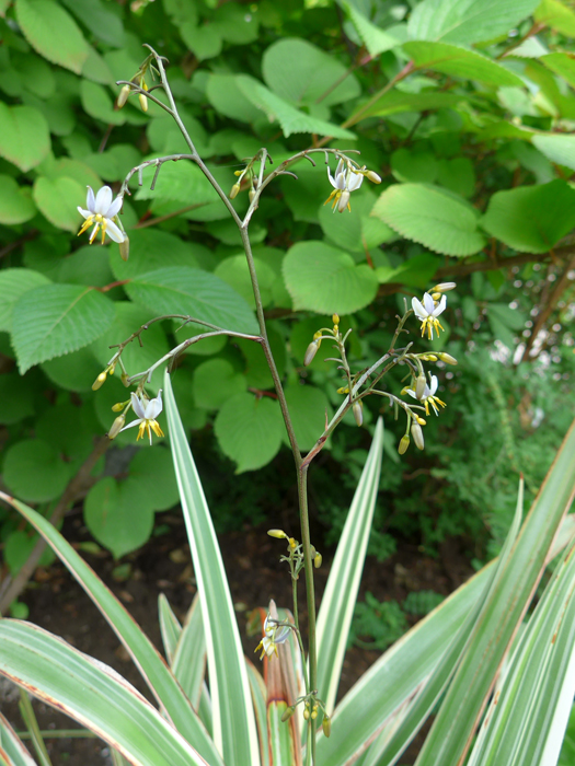 | 形態 | 地際から剣形の葉が叢生する。葉は濃緑色で光沢があり、基部は重なり合い、先端は垂れる。5〜7月頃、花茎を立ち上げ、茎頂にまばらな円錐花序を作り、薄紫色〜青紫色の花を咲かせる。花被片は6枚で、次第に反り返る。果実はいびつな球形の液果で鮮やかな青紫色。 |
