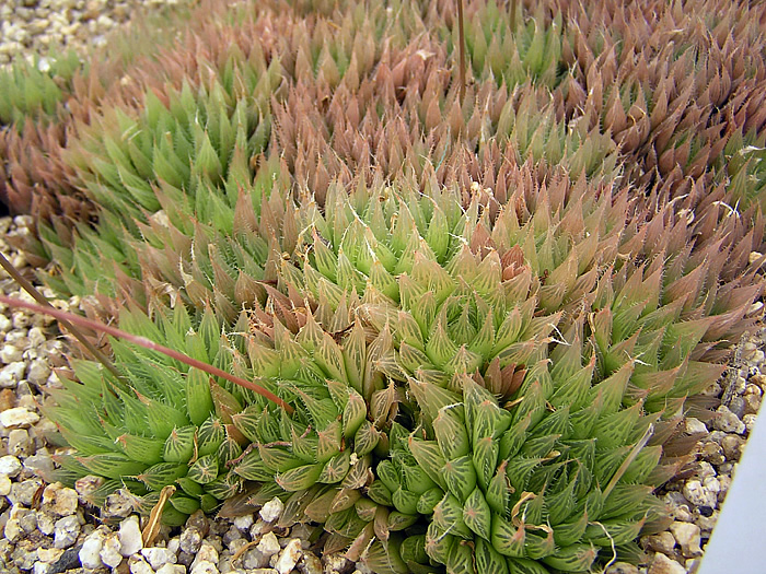 | 形態 | 地際から多肉質な葉がロゼット状に叢生する。葉色はくすんだ薄緑色で、寒さでやや紅葉する。葉は細くて扁平な三角錐形で、先端部には半透明の窓があり、縦筋が入る。葉縁には細かいノギがある。春〜夏頃、花茎を立ち上げ、茎頂に花序を作り、白っぽい花を咲かせる。花被片は6個で、中央部に赤っぽいグレーの縦筋が入る。 |