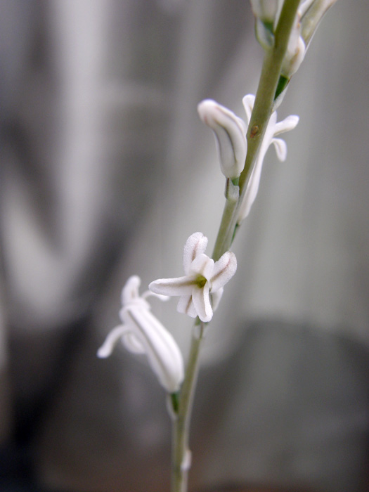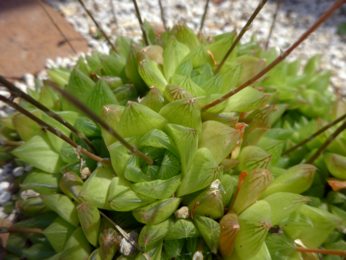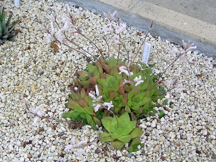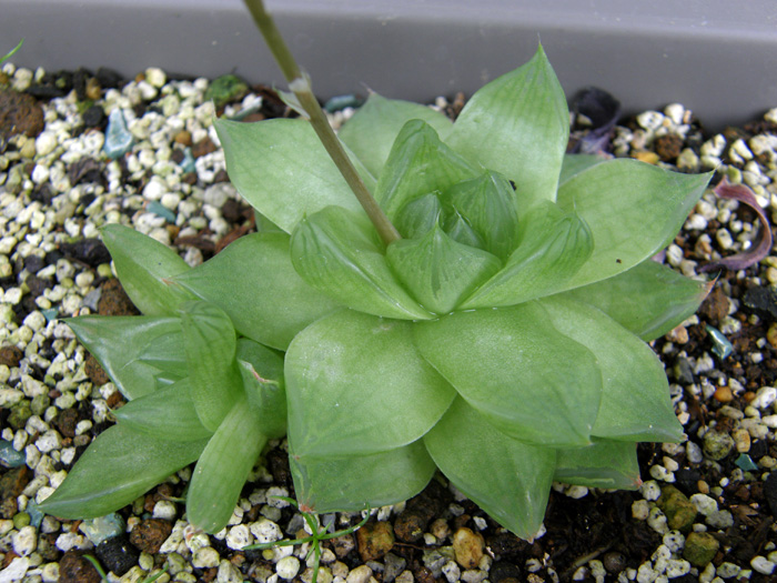 | 形態 | 地際から多肉質な葉がロゼット状に叢生する。葉色は明緑色で、寒さでやや紅葉する。葉は扁平な三角錐形で、先端部には半透明の窓があり、縦筋が入る。葉は幅広でロゼットはバラの花のように整う。春〜夏頃、花茎を立ち上げ、茎頂に花序を作り、白っぽい花を咲かせる。花被片は6個で、中央部に赤っぽいグレーの縦筋が入る。 |