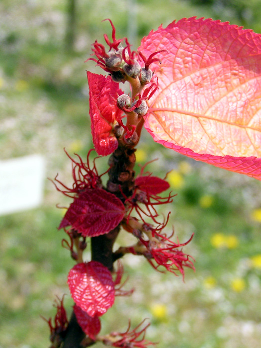 | 形態 | 茎は直立して株立ちになる。分枝はあまりしない。3~4月頃新葉が芽吹き、鮮やかな紅色が目立つ。葉は徐々に白っぽくなり、5月頃には緑色に変わる。葉は先が尖った広卵形〜ハート形で、鋸歯があり、互生する。花はほぼ葉の芽吹きと同時で、雄花は花柄がほとんど無く、数十個が球状にかたまり、クリーム色の雄しべ8個が反り返るように咲く。雌花は花柄があり、数個が互生し、紅色の糸のような花柱が3本ある花が咲く。 |