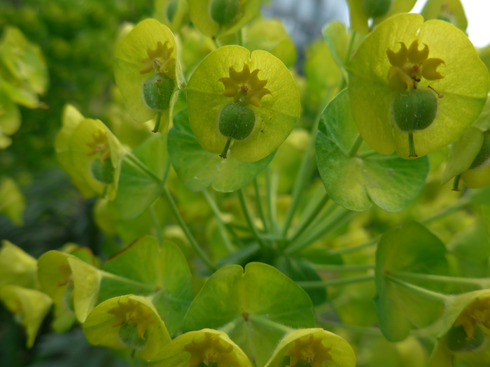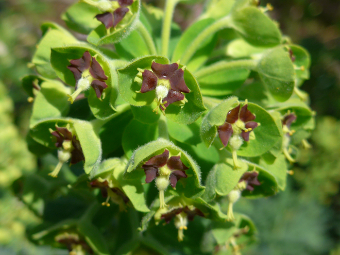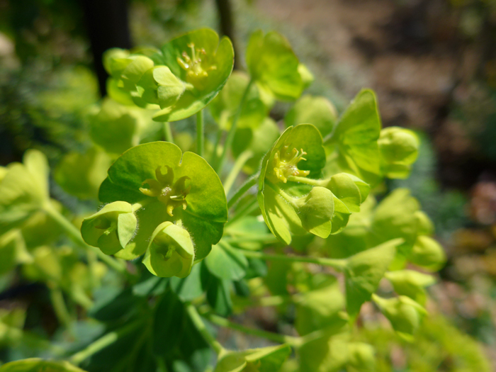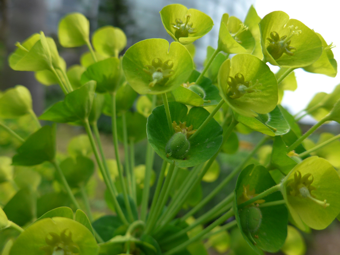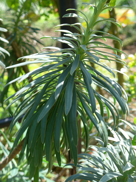 | 形態 | 茎は地際から叢生し、円柱形で直立し、基部は木質化する。葉は銀青緑色で、狭楕円形〜狭倒卵形で、鈍頭で、無柄、全縁で、螺旋状に互生する。3~5月頃、茎頂に円柱形に花序を作り、杯状花序をたくさん咲かせる。杯状花序は、中央に子房があり、その周囲を黄色い三日月形の4つの腺体が囲む。下には黄色い漏斗状の苞葉がつく。花が咲くと、苞葉の基部からさらに二本の枝を出し、そこにも花を咲かせる。受粉した子房は柄が伸びて下向きに垂れ下がる。果実は3室に分かれた蒴果で、熟すと横倒しだった軸が直立する。 |