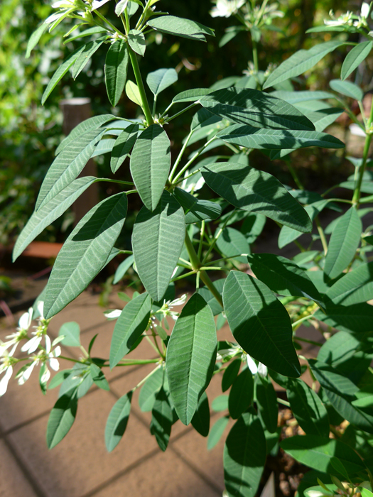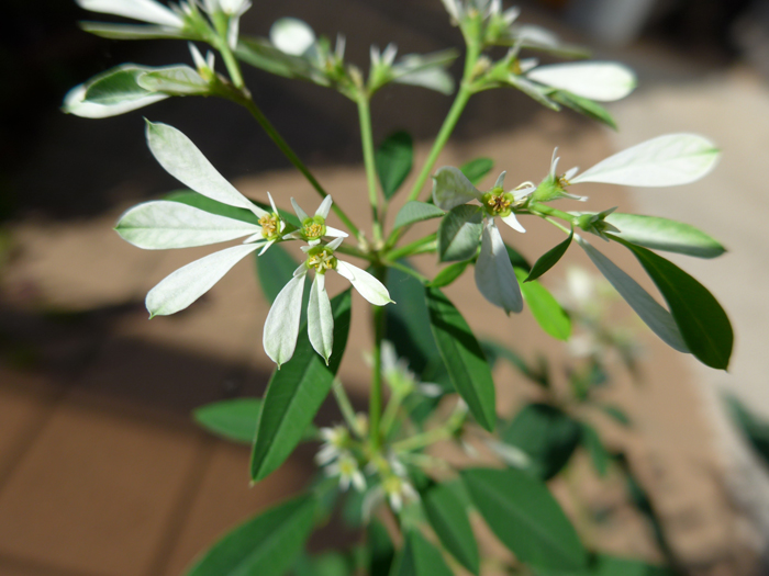 | 形態 | 茎は直立し、よく分枝する。葉は鈍頭の長楕円形で、全縁で、葉柄があり、輪生〜対生する。11月〜翌1月頃、茎頂に杯状花序を作る。杯状花序は、中央に子房があり、その周囲を黄緑色で楕円形の5つの腺体と白色で披針形の付属体が囲む。下には白色で先が尖ったへら形の苞葉が数個つく。受粉した子房は柄が伸びて下向きに垂れ下がる。果実は3室に分かれた蒴果。 |