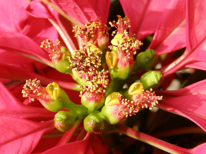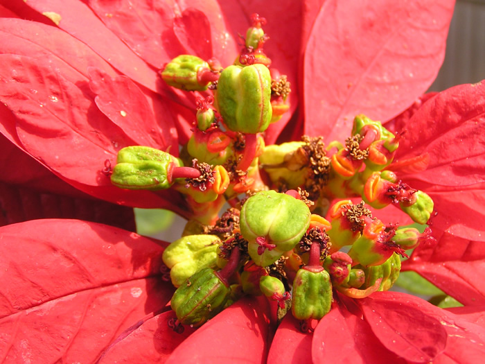 | 形態 | 茎は直立し、よく分枝する。葉は先が尖った卵形で、全縁で、互生する。冬から春にかけ、茎頂に杯状花序を作る。杯状花序は、中央に子房があり、その横には黄色い袋状の腺体が1〜2個つく。下には赤色で葉と同形の苞葉が数個つく。受粉した子房は柄が伸びて下向きに垂れ下がる。果実は3室に分かれた蒴果。 |