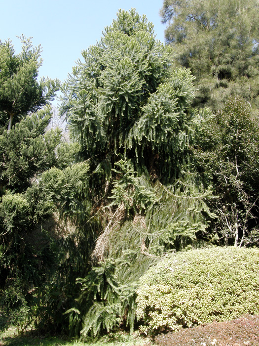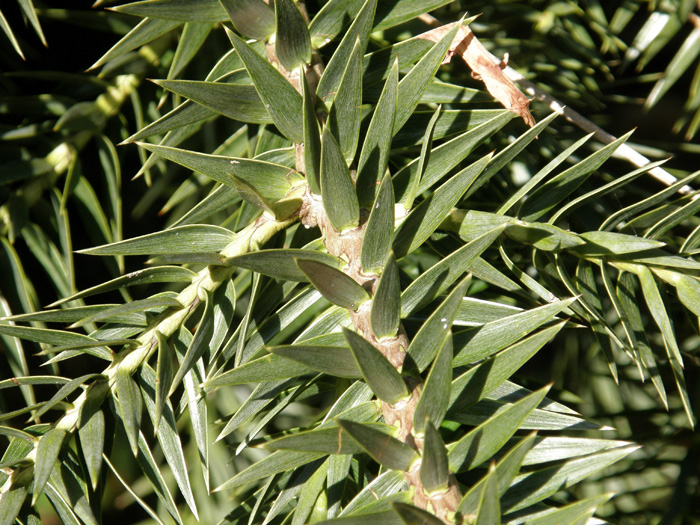 | 形態 | 幹は直立し、太い枝を水平に出す。樹形は卵形だが、古木になると下枝が落ち、長い幹の上部にのみ枝がある独特な形状になる。樹皮はごつごつした灰白色。葉は革質で、先端が鋭く尖った鋭三角形で、無柄で、枝にらせん状につく。葉のついた枝は、長くなると自重で枝垂れてくる。葉は脱落しにくく、枝ごと落下する。球果はいびつな球形~卵型で、表面は鱗状になる。種子は赤茶色の楔形。 |