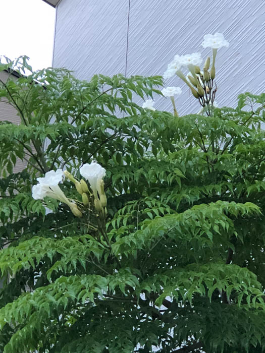 | 形態 | 幹は直立する。樹皮は茶褐色で、縦にひび割れる。葉は2~3回羽状複葉で、対生する。小葉は光沢がある革質の緑色で、先が細く尖った卵形で、葉脈に沿って波打つ。幼木では粗い鋸歯があるが、成長するとほぼ全縁になる。5〜9月頃、茎頂に円錐花序を作り、漏斗形で白色〜淡黄色の花を咲かせる。花の先端は5裂して平開し、裂片は丸い。花には芳香があり、夕方から開き、朝方にはしぼんで散る。果実は細長くカールした紐状の蒴果で、束になって垂れ下る。熟すと2つに裂け、種子が出てくる。種子は扁平な楕円形で、両短辺に半透明の翼がつく。 |