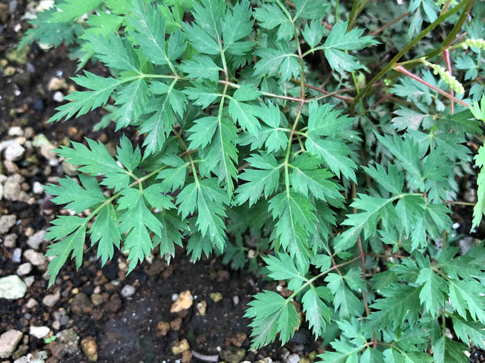 | 形態 | 茎や葉柄は赤味を帯びる。葉は2〜3回奇数羽状複葉で、互生する。小葉は先が尾状に細長く尖った卵形で、深く切れ込む。5〜6月頃、茎先に分枝した細長い花序を作り、白色の小さな5弁花を多数つける。秋には葉が黄色〜オレンジ色になって落葉する。 |