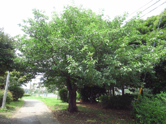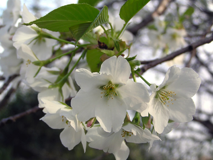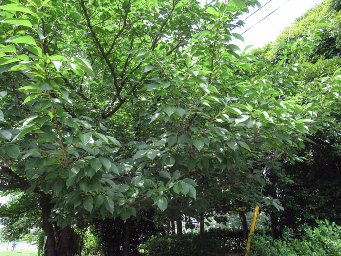 | 形態 | 大木になる長寿な種。樹皮は紫褐色で、横に長い皮目がある。花期は3月下旬~4月中旬頃。葉の展開と同時に開花する。花は白〜淡紅色の5弁花で、平開し、花弁の先は切れ込みがある。萼筒は筒形で、緑色〜やや赤味を帯びる。葉、花柄などは無毛。新葉の色は赤味を帯びることが多い。葉は先が細長く尖った長楕円形〜長卵形で、鋸歯があり、互生する。果実は球形の核果で、5~6月頃、黒紫色に熟す。葉は、晩秋にオレンジ色〜朱色になって、落葉する。 |