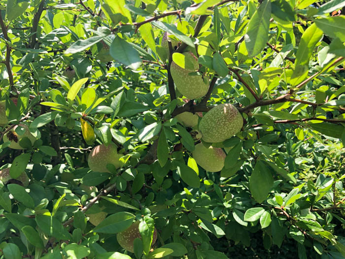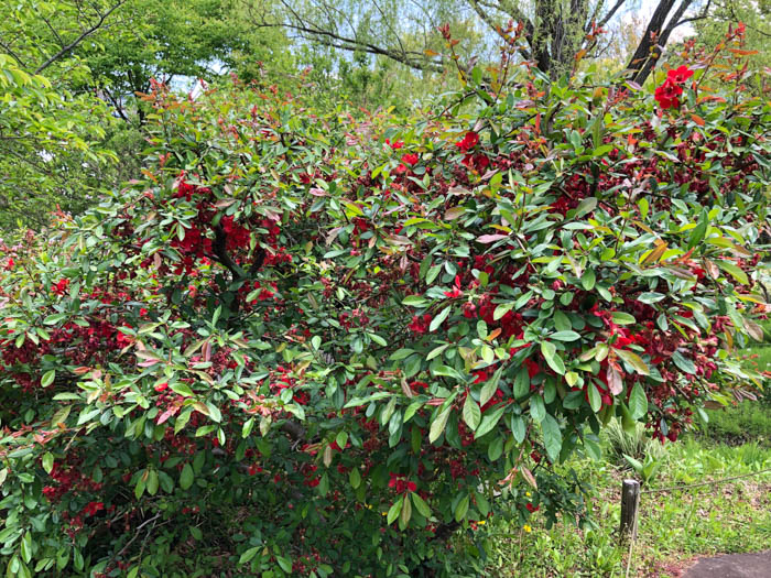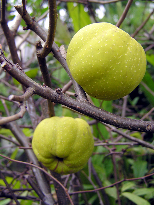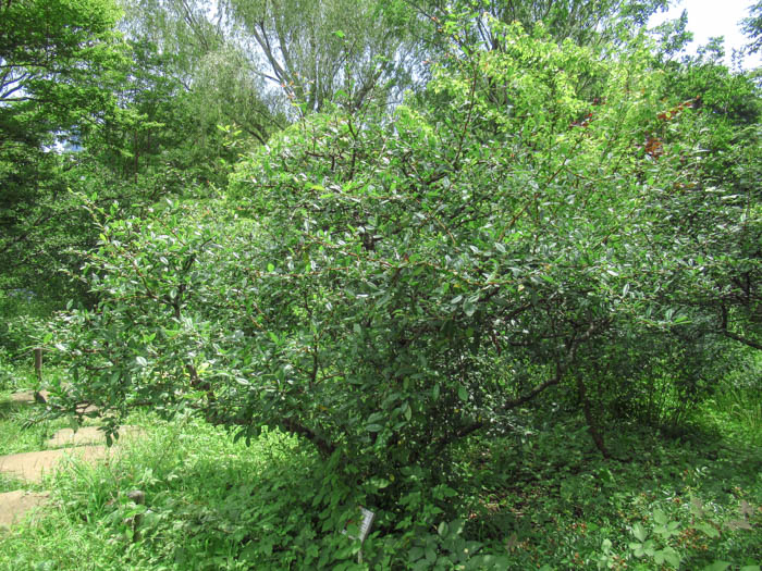 | 形態 | 主幹がなく、株立ち状になる。樹皮は茶黒褐色で、短枝は棘になる。葉は先端の尖った楕円形~長楕円形で、細かい鋸歯があり、互生する。大きな托葉がある。3~4月頃、短枝に葉の展開の前、または同時に葉腋に1~3個の5弁花をつける。花には両性花と雄花があり、両性花は子房が発達するため花筒が長い。果実は楕円形の梨状果で、7~8月頃に黄色に熟す。 |