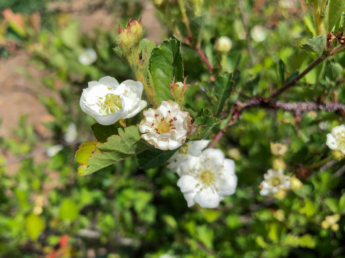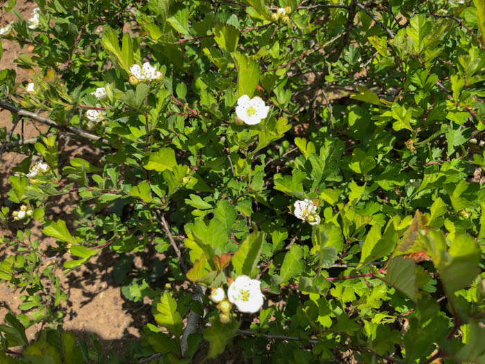 | 形態 | 幹は灰褐色。若い枝は紫褐色でよく分枝し、枝には短枝が変形した棘がある。葉は倒卵形、または掌状に3〜5裂し、粗く不揃いな鋸歯がある。長枝につく葉の葉柄の基部には粗い鋸歯がある托葉がつく。4〜5月頃、枝先に白い5弁花を咲かせる。雄しべは多数。果実は扁球形の偽果で、9~10月頃、赤色に熟す。果実の先端に萼片が残る。 |