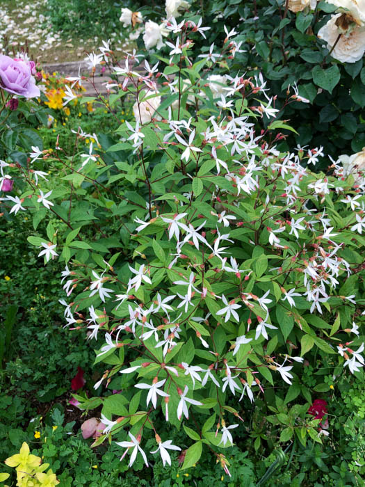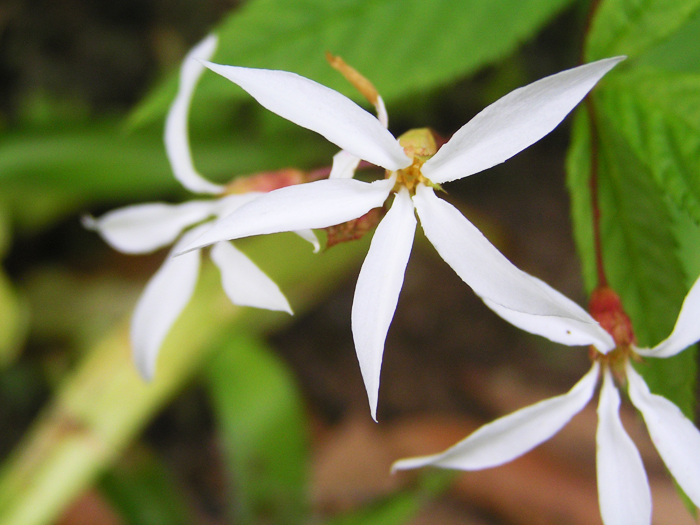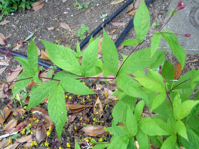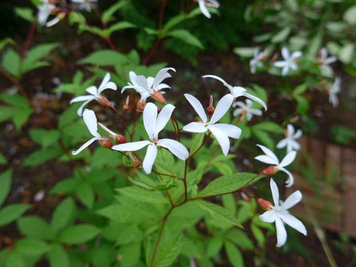 | 形態 | 茎は直立し、よく分枝する。大株になると地際からたくさんの茎が叢生して株立ち状になる。茎の色はえんじ色。葉は3出複葉で、葉柄は無く、互生する。小葉は先が尖った楕円形で、鋸歯がある。5〜6月頃、枝先に円錐花序を作り、白い5弁花を咲かせる。花弁先端は細く尖る。秋には紅葉する。 |