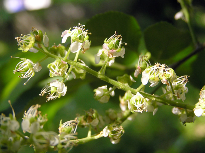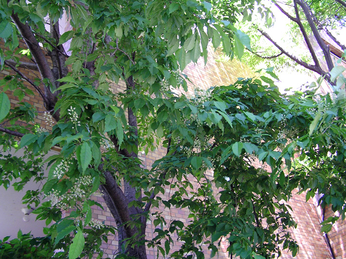 | 形態 | 樹皮は灰~褐色。葉は先が尾状に尖った楕円形で、細かい鋸歯があり、互生する。5月頃、葉が展開した後に、本年枝の先端に総状花序を出す、花は白色5弁で、長く多数ある雄しべが目立つ。花序枝の下側に葉はない。花後、先端が尖った球形の核果ができる。果実は、黄色→赤と変化し、7〜8月頃赤黒色に熟す。 |
