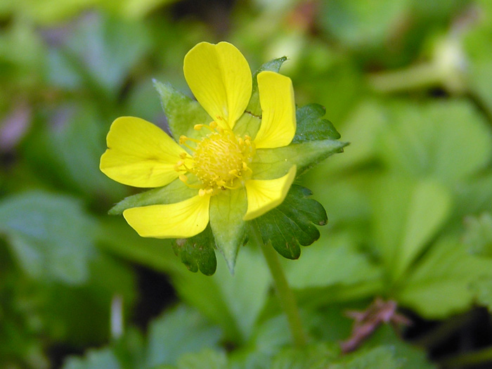 | 形態 | 茎は地面を這う。葉腋からランナー(匍匐枝)が伸びて子株をつける。葉は3出複葉で、有柄で、根出または互生する。小葉は倒卵形で、平行脈がよく目立ち、粗い鋸歯がある。4~6月に黄色の花をつける。花弁と萼はそれぞれ5個で、萼片の外側には同数の副萼片がある。副萼片は比べて大きく、倒卵形で粗い鋸歯がある。雄しべの葯は黄色。雄しべ雌しべは多く、花托は半球形。果実は偽果で、花後、花托が肥大し、球形の実になる。果床は淡紅色で、偽果表面につく痩果は皺があって光沢がない。 |