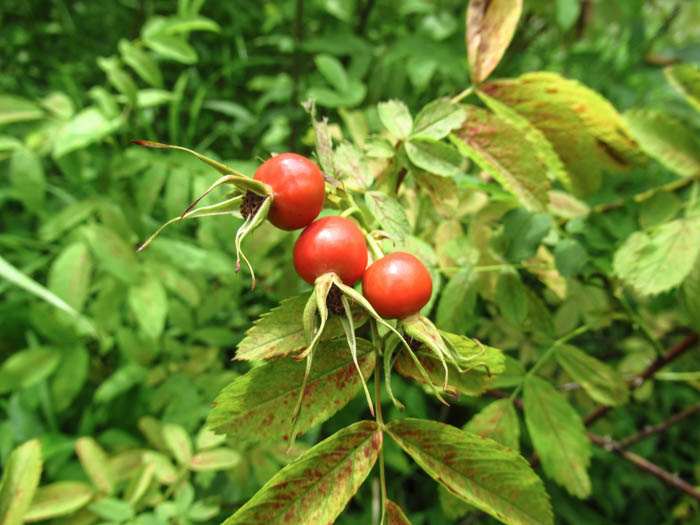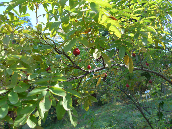 | 形態 | 茎や枝には棘がまばらに散生するか、無い。葉は5~9枚の小葉からなる奇数羽状複葉で、互生する。小葉は先が尖った長楕円形で光沢がなく、鋸歯がある。6~7月頃、ピンク色の5弁花を咲かせる。果実はほぼ球形の偽果で、秋に朱色に熟す。 |