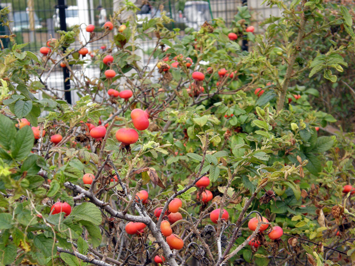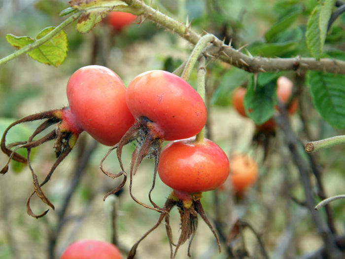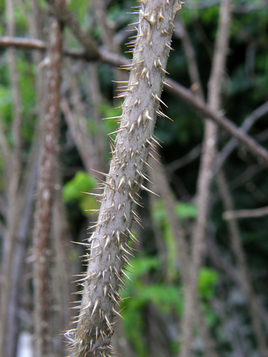 | 形態 | 株立ち樹形で、太い茎や枝には大小の鋭い棘が密生する。葉は小葉7~9枚からなる奇数羽状複葉で、互生する。小葉は先が尖った楕円形で、全体がやや凸凹しており、鋸歯がある。葉表は光沢があり無毛で、葉裏には毛が密生する。5~8月頃、濃桃色の5弁花を咲かせる。花には強い芳香がある。果実は扁球形の偽果で、8~10月頃、朱色に熟す。 |