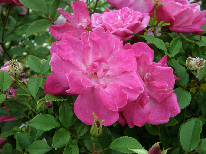 | 特徴 | 樹高は1m程で、低いブッシュ状になり、茎には平たい棘がまばらにつく。花は八重咲きで深紅色。 |
