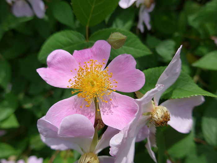 | 形態 | 細い枝は枝垂れ、または棘で他物にひっかかりながら成長する。葉は小葉3~5枚からなる奇数羽状複葉で、互生する。小葉は先が細く尖った楕円形で、鋸歯がある。6月頃、ピンク色の5弁花を咲かせる。雌雄異株で、雌株しか結実はしない。果実はほぼ球形の偽果で、秋には赤色に熟す。 |
