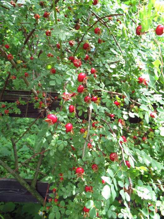 | 形態 | 細い枝を横に広がるように伸ばし、棘で他物にひっかかりながら成長する。若枝と棘は赤味を帯びる。葉は小葉7~13枚からなる奇数羽状複葉で、互生する。小葉は楕円形~長楕円形で、鋸歯がある。4月頃、薄黄色の5弁花を咲かせる。果実は扁球形の偽果で、7~8月頃、赤色に熟す。 |
