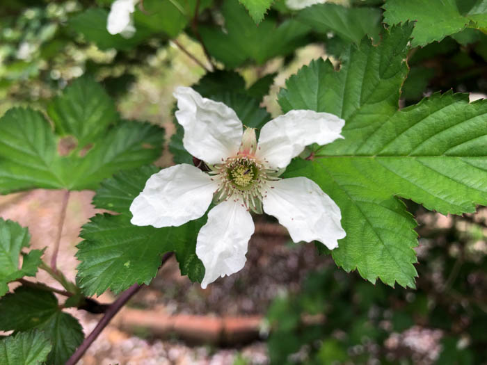 | 形態 | 茎や葉柄には鋭い棘がある。葉は掌状に3〜5裂し、鋸歯があり、互生する。4〜5月頃、白色の5弁花を咲かせる。花は下向きに咲く傾向がある。果実は球形の集合果で、5〜6月頃、オレンジ色に熟す。 |