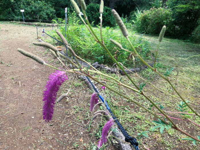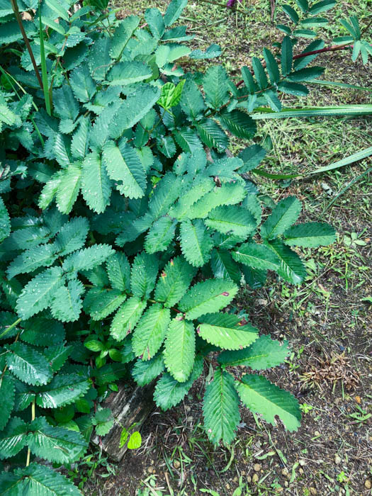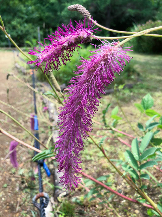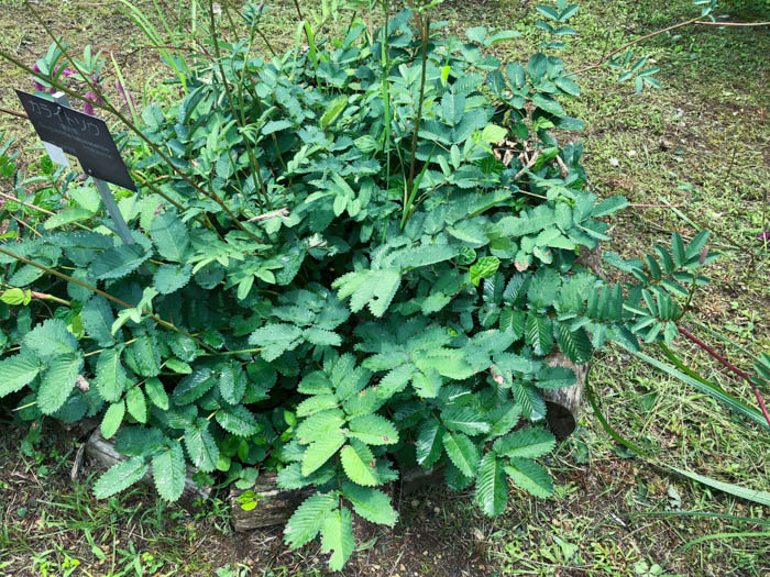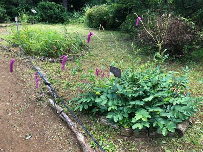 | 形態 | 地下には太い根茎があり、4~5月に長い柄のある根生葉を出す。葉は9~13の小葉からなる奇数羽状複葉で、くすんだ灰緑色。小葉は楕円形~長楕円形で鋭い鋸歯がある。7~9月頃、花茎を伸ばして、先端に円柱形の穂状花序を1~数個作る。穂状花序はピンク色で細長く、先端は垂れ下がる。茎には茎生葉が互生につき、上部のものほど小葉の数が少ない。花弁はなく、紅紫色の萼片が4枚で、ピンク色の雄しべが萼片から長く突き出す。花は上部(先端)から咲き進む。 |