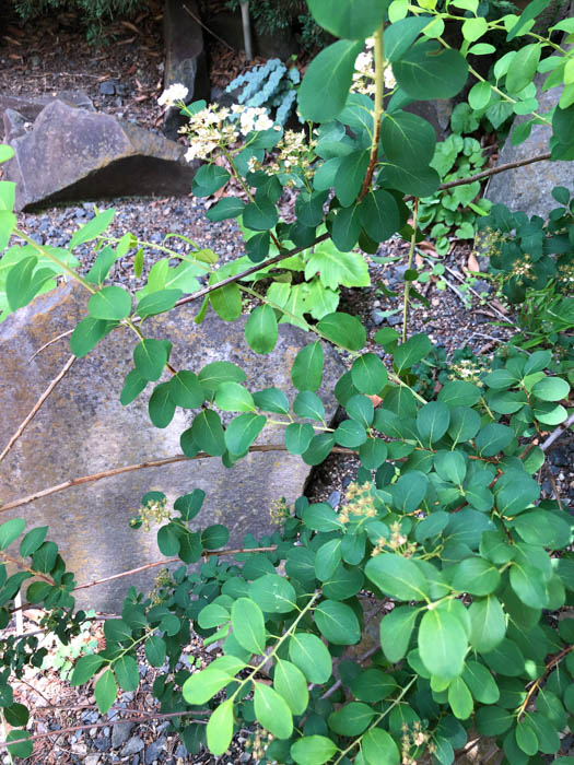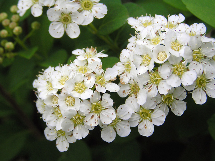 | 形態 | よく分枝し、岩場を這うように伸びる。今年枝は赤茶色で稜がある。葉は明緑色の広楕円形で、全縁または先端に数個の鋸歯があり、互生する。5~7月頃、枝先に半球状の花序を作り、白色の5弁花を多数咲かせる。雄しべは多数で、放射状に広がり、花弁と同じくらいの長さ。果実は袋果で、8〜9月頃熟す。 |