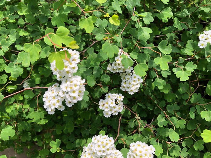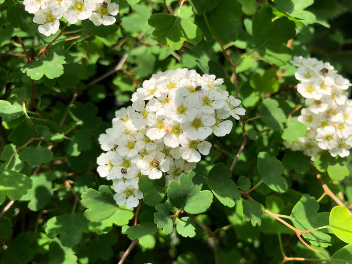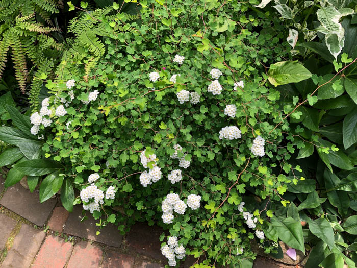 | 形態 | よく分枝し、岩場を這うように伸びる。若枝は褐色。葉は明緑色の広卵形〜菱形状卵形で、不分裂または3〜5裂し、不揃いな鋸歯があり、互生する。4〜5月頃、枝先に半球形の花序を作り、白色の5弁花を咲かせる。雄しべは多数で、放射状に広がり、花弁と同じくらいの長さ。果実は袋果で、7〜8月頃熟す。 |