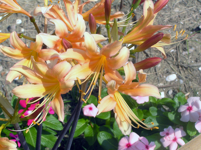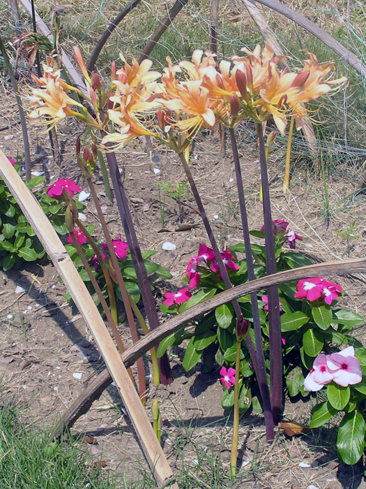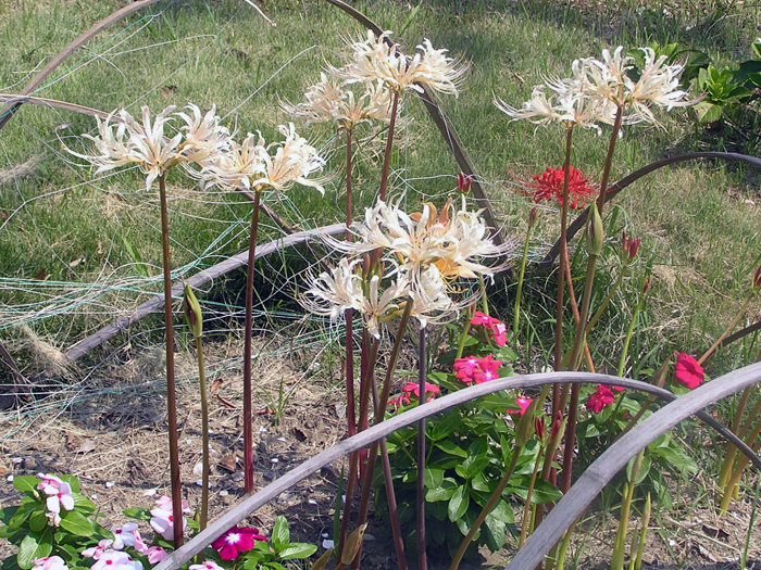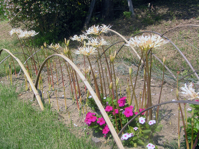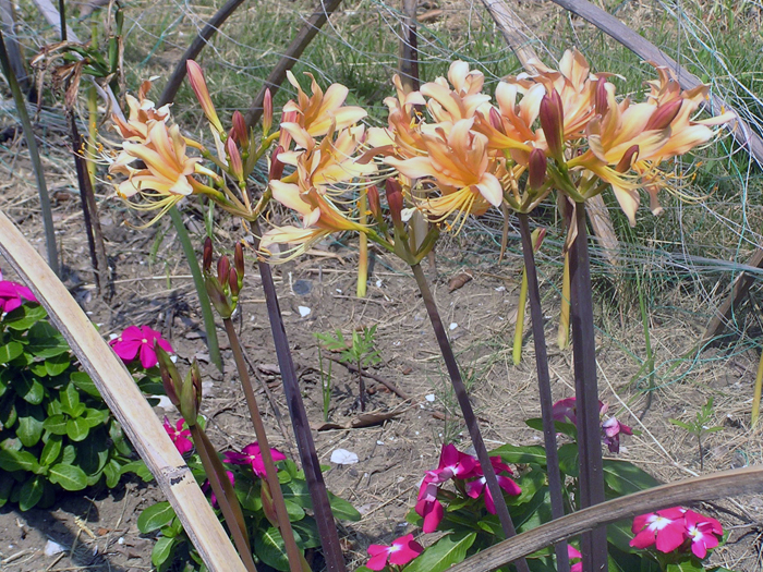 | 解説 | 地下部に鱗茎ができる。鱗茎は有毒物質のアルカロイドを含有する。品種によって時期が違うが、夏~秋頃に花茎を立ち上げ、先端に5~10個の花を咲かせる。花被片は6枚。葉は線形や扁平な紐状で、花後に地際から叢生させ、初夏には枯れるので、花時には葉がない。葉の出る時期は、花後すぐや翌年早春などいろいろ。多くの園芸品種がある。 |