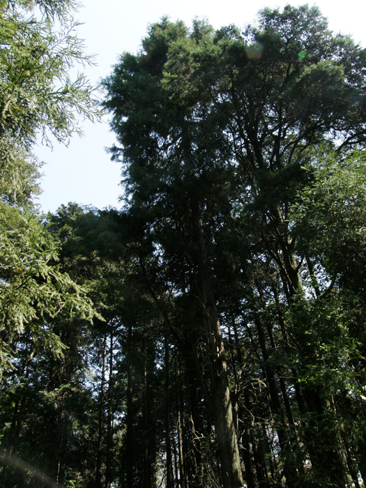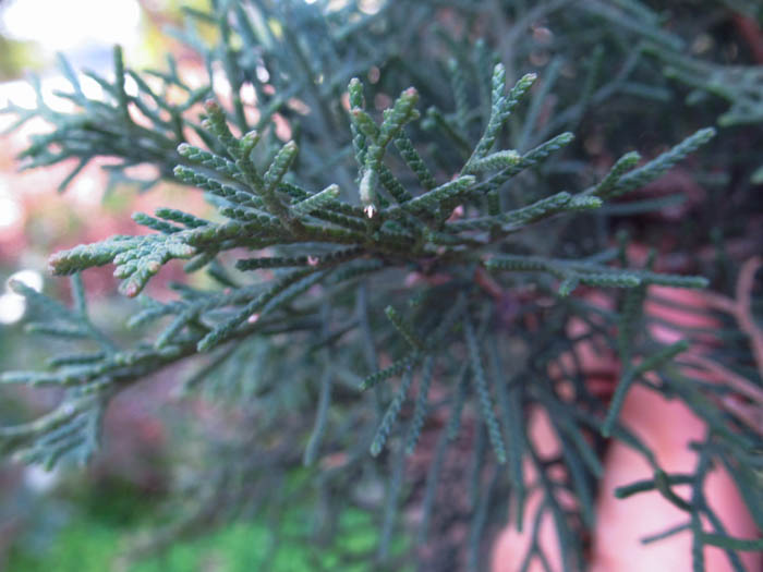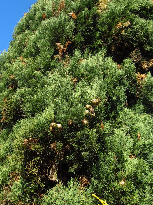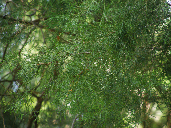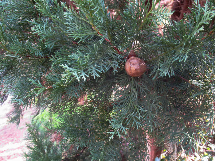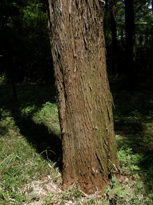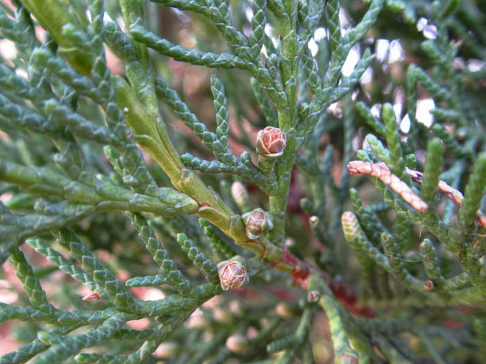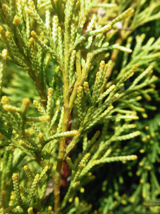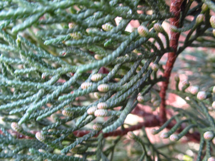 | 形態 | 幹は直立し、樹形は狭円錐形〜円錐形になる。樹皮は茶褐色で縦に長く裂ける。枝は斜上し、旺盛に分枝して枝や葉が密生する。葉は濃緑色で、鱗片状で細い糸状になり、表裏の区別は無い。雌雄異花で、早春に枝先に雌花と雄花をそれぞれ単生する。雄花は長球形で茶褐色〜オレンジ色、雌花は鱗片状で薄黄緑色の葉の塊のよう。果実は球形の球果で、灰褐色に熟す。 |