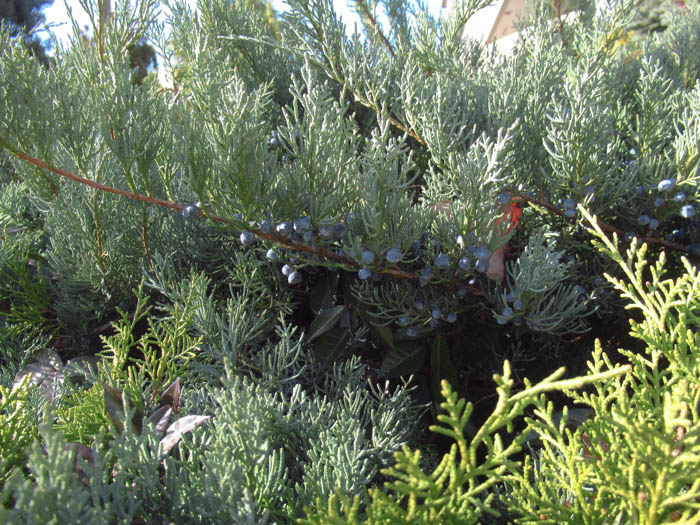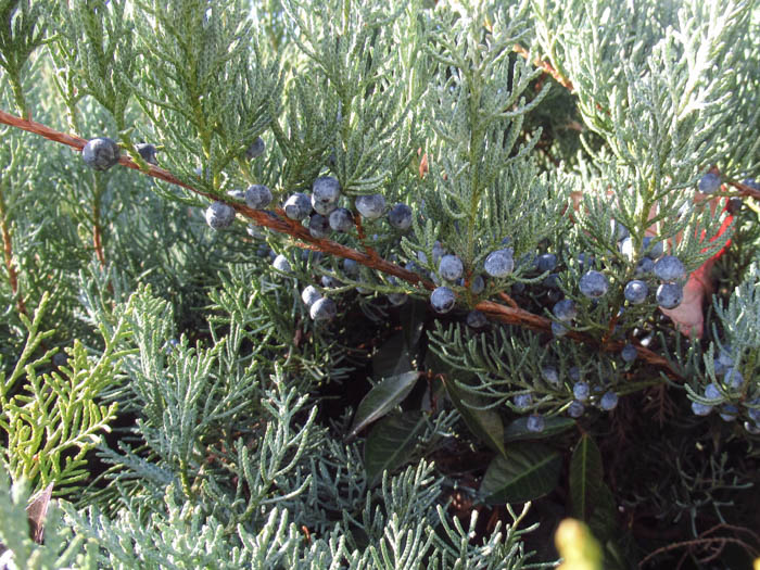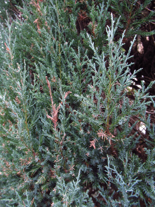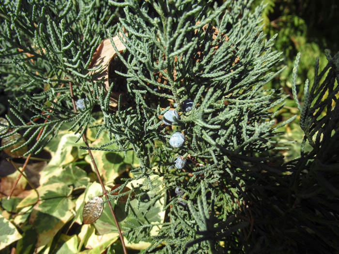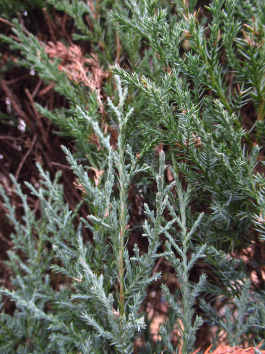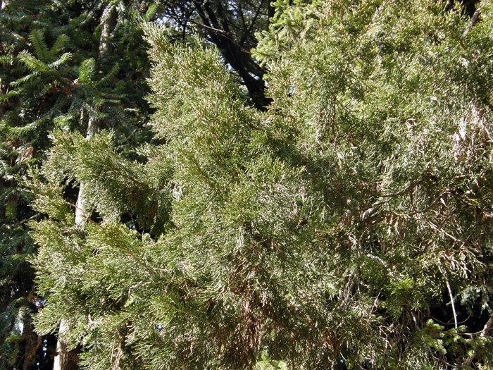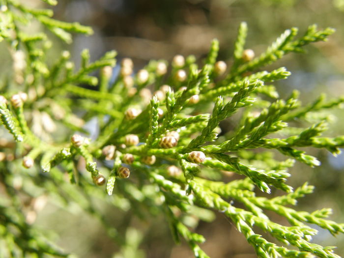 | 形態 | 幹は直立し、樹形は円錐形になる。樹皮は赤褐色で縦に長く裂ける。葉は灰緑色〜暗緑色で、開き気味の鱗片状で先端が尖り、表裏の区別は無い。幼木では針葉、成長すると次第に鱗葉が増え、針葉と鱗葉が混在する。葉は冬季には褐色や茶褐色に変色する。雌雄異株で、早春にそれぞれ枝先に雌花や雄花を単生する。雄花は長球形で茶褐色〜オレンジ色、雌花は鱗片状で薄茶色の葉の塊のよう。果実は球形の球果で、ワックス質に覆われた灰青色に熟す。 |