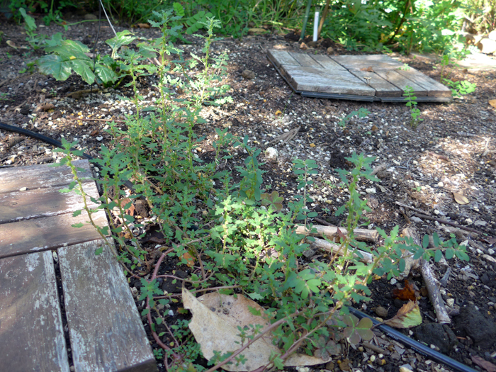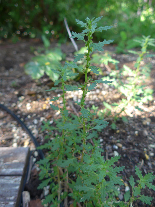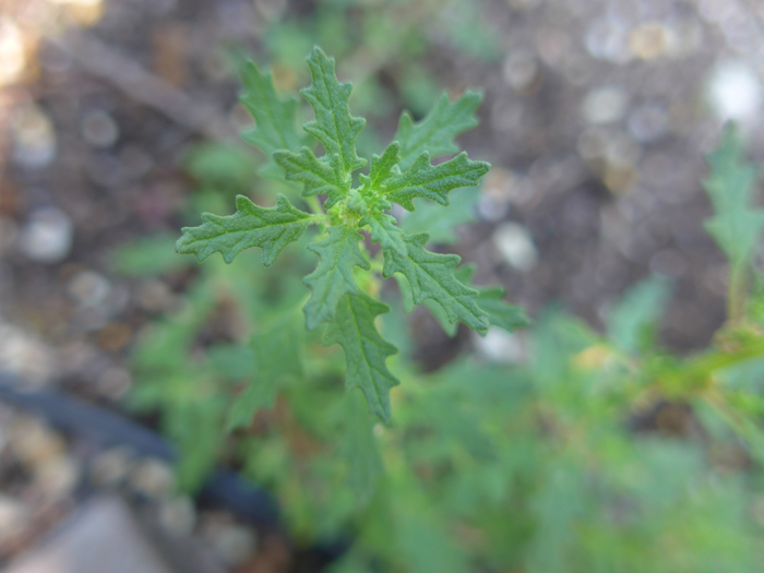 | 形態 | 茎は地面を這い、よく分枝し、先端は斜上する。葉は長楕円形で、粗い波状の鋸歯があり、表面には白い毛がまばらに生え、互生する。葉裏には黄色い腺点があり、特異な臭いがある。7〜10月頃、葉腋に花序を作り、小さな淡黄緑色の両性花と雌花を咲かせる。果実は胞果で、落ちずに残った花被片に包まれる。 |