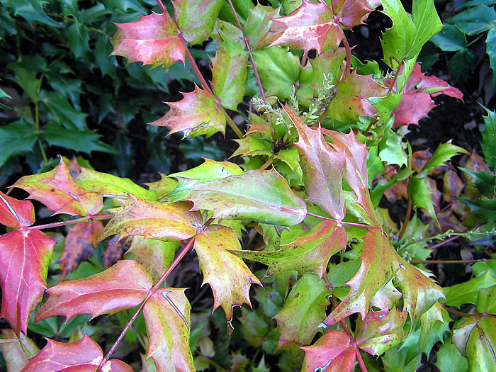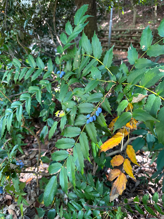 | 類似 | 「ヒイラギナンテン」は、花期が春。花序は枝垂れる。小葉は5〜8対で、小葉は先が尖った楕円形。 「ホソバヒイラギナンテン」は、花期が秋。花序は立上がる。小葉は3〜4対で、小葉は先が尖った狭楕円形〜披針形。 「ナリヒラヒイラギナンテン」は、花期が秋。花序は立上がる。小葉は5〜15対で、小葉は披針形。 |