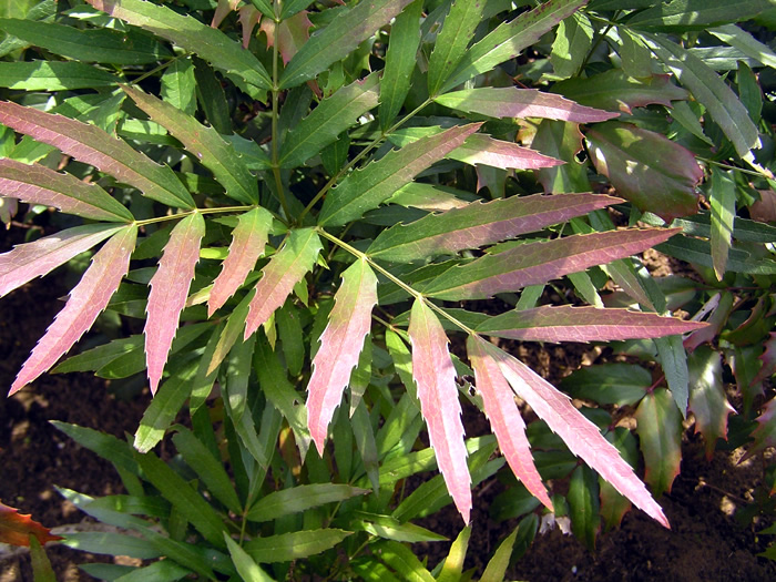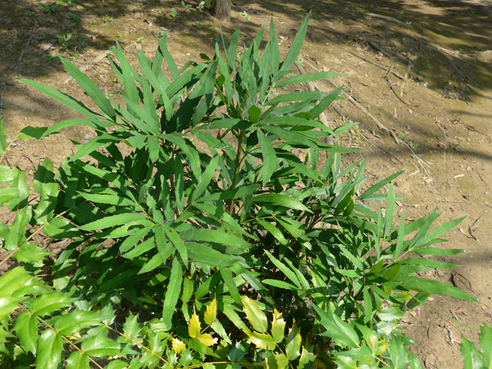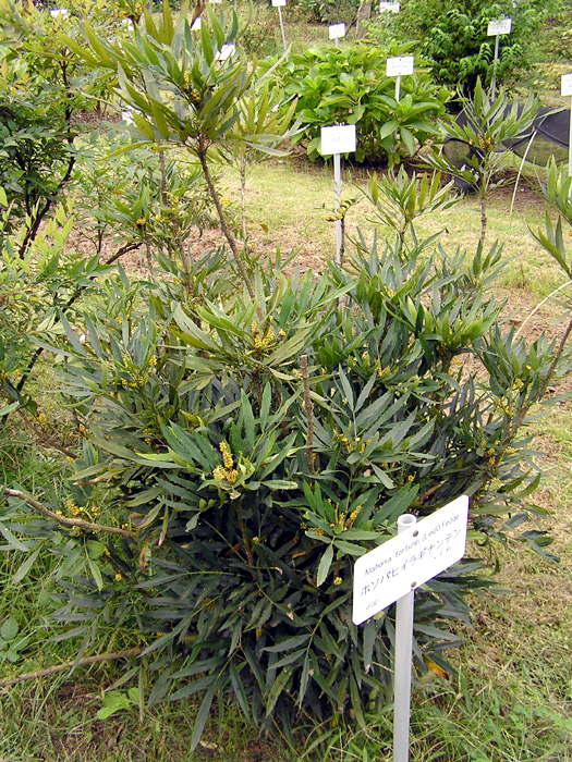 | 類似 | 「ヒイラギナンテン」は、花期が春。花序は枝垂れる。小葉は5〜8対で、小葉は先が尖った楕円形。 「ホソバヒイラギナンテン」は、花期が秋。花序は立上がる。小葉は3〜4対で、小葉は先が尖った狭楕円形〜披針形。 「ナリヒラヒイラギナンテン」は、花期が秋。花序は立上がる。小葉は5〜15対で、小葉は披針形。 |