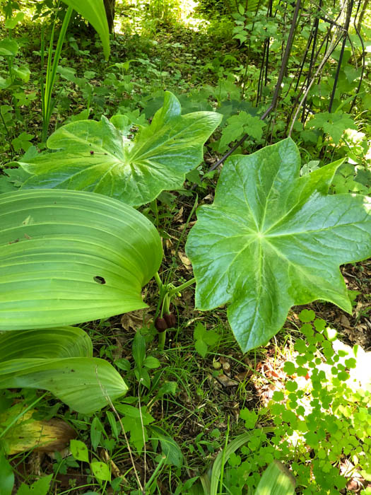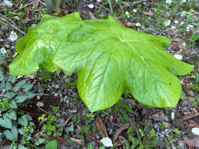 | 形態 | 地面から出た茎から、大きな葉を2枚上向きに広げる。葉は円形で掌状に浅く7~9裂し、光沢があり、細鋸歯がある。葉柄は盾状に葉の中央部から出る。4月下旬〜6月上旬頃、葉腋から5~8個の長い花柄を垂らし、臙脂色の花を下向き咲かせる。花弁は6〜9枚で、内側に丸まって開かない。果実は長球形で紫黒色に熟す。 |