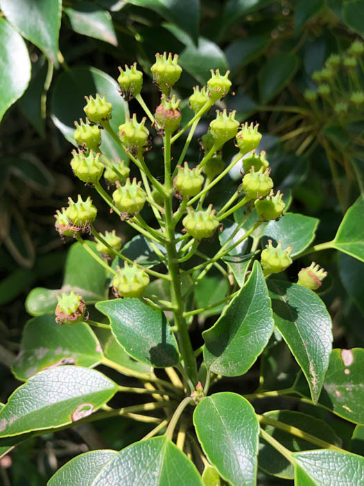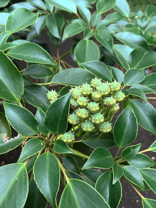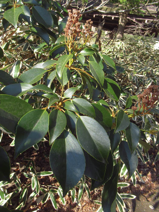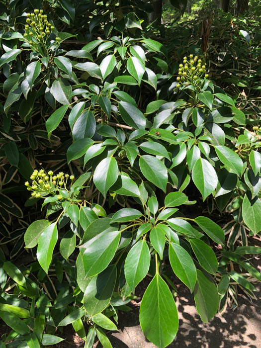 | 形態 | 樹皮は灰褐色で小さな皮目がある。枝を面状に広げ、階層を作り、葉の重なりが少ないような構造になる。葉は先が尖った広倒卵形〜長倒卵形で、鈍い波状の鋸歯があり、革質で光沢があり、枝先に集中して輪生するように互生する。幼木の葉は細長いものが多い。5〜6月頃、枝先に花序を作り、薄黄緑色の花を咲かせる。花には花弁も萼も無く、雌しべ6〜10個が輪生し、その周囲を多数の雄しべが囲む。果実は袋果が6〜10個集まった集合果で、扁球形で袋果の数だけ角が出て、上から見ると星形になる。10月頃、熟すと裂開して多数の種子を出す。 |