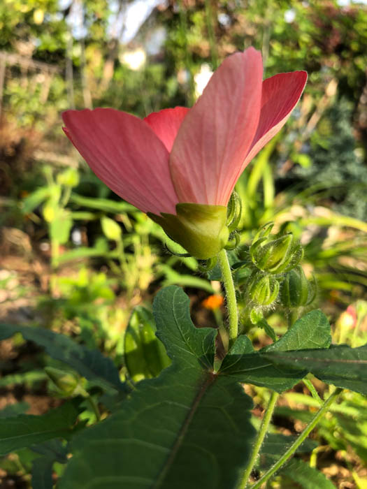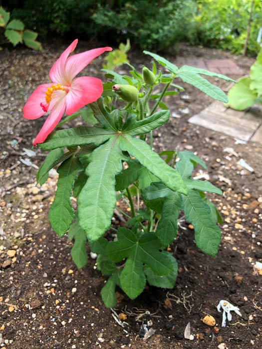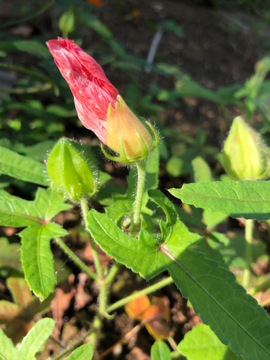 | 形態 | 地下には塊茎ができる。茎には軟毛が生え軟弱で半蔓性になる。葉は変異が多く掌状に5深裂したり、ほぼ円形だったりで、不揃いの鋸歯があり、長い葉柄があり、互生する。7~9月頃、葉腋に、淡紅色〜赤色の5弁花を咲かせる。花は一日花で、早朝に開き、昼過ぎには萎む。果実は先が尖った柱状の蒴果で、5つの稜がある。原産地では乾季に地上部が枯れ、地下の塊茎で乾季を越す。 |