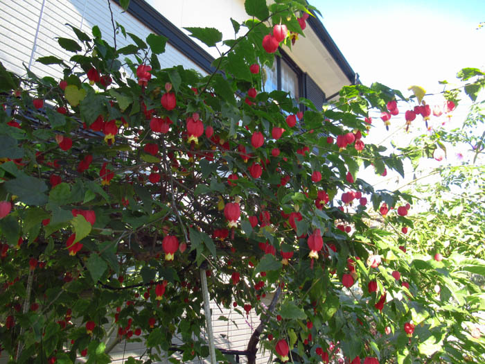 | 形態 | 枝は細く軟弱で、他物によりかかって成長し、枝先は垂れる。葉は長三角形~ハート形で、鋸歯があり、葉柄があり、互生する。6~10月頃、葉腋に長い花柄のある花を吊り下げ、下向きに咲かせる。花弁は淡黄色の5弁花で、赤い5稜がある袋状の萼からやや突き出す形で咲く。花からは褐色の雄しべがついた花柱が突き出る。 |