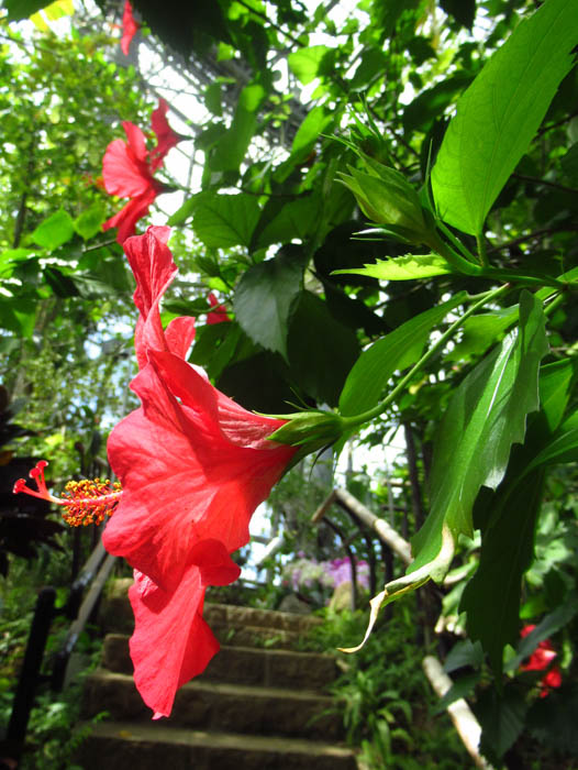 | 形態 | 茎は直立し、よく分枝する。葉は濃緑色で光沢があり、先が尖った卵形~狭卵形で、大きく不揃いな鋸歯があり、葉柄があり、互生する。葉柄のつけ根には針状の托葉がつく。6~11月頃、熱帯~亜熱帯地域では周年、葉腋から赤い5弁花を咲かせる。雌しべと雄しべは途中まで合着して柱状になり、長く突き出す。朝開いて夕方には萎む一日花。5裂の萼の外側を、色のついた苞葉がとりまいているので、萼が2重になっているように見える。 |