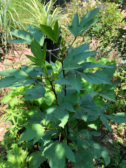 | 形態 | 茎は直立し、赤味がかることが多く、上部で分枝する。茎の根本は木質化する。葉は掌状に3~5深裂し、浅い鋸歯があり、長い葉柄があり、互生する。短日植物で、11〜12月頃、茎の上部の葉腋に5弁の一日花を咲かせる。花はクリーム色で、基部がえんじ色。花弁は螺旋状に重なりあう。果実は円錐形の蒴果で、萼が肥厚して果実を包む。 |