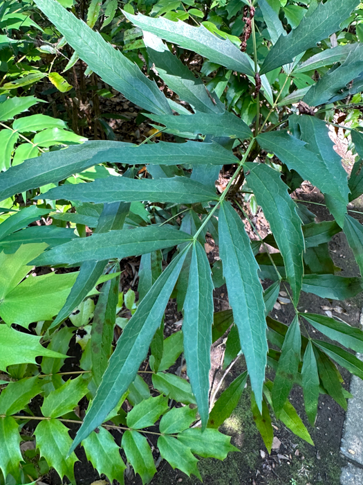 | 類似 | 「ヒイラギナンテン」は、花期が春。花序は枝垂れる。小葉は5〜8対で、小葉は先が尖った楕円形。 「ホソバヒイラギナンテン」は、花期が秋。花序は立上がる。小葉は3〜4対で、小葉は先が尖った狭楕円形〜披針形。 「ナリヒラヒイラギナンテン」は、花期が秋。花序は立上がる。小葉は5〜15対で、小葉は披針形。 |
