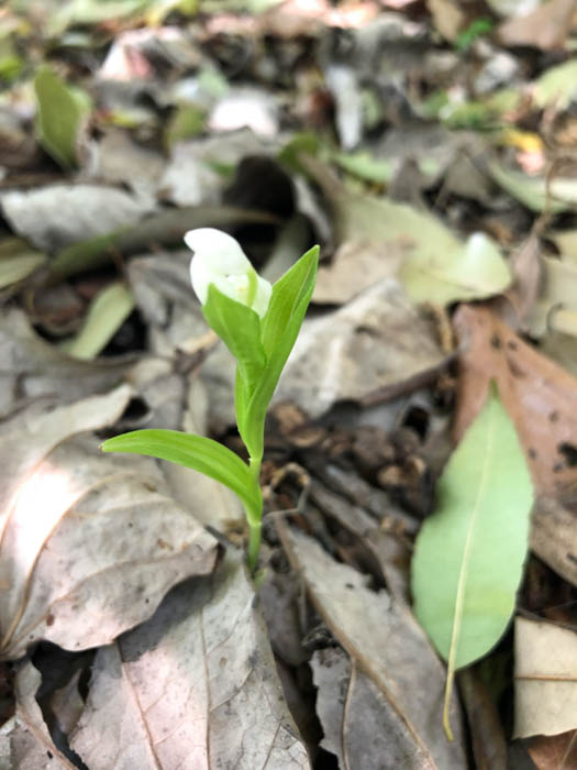 | 形態 | 葉は広披針形〜先が尖った狭楕円形で平行脈が何本もあり、花茎を抱き、3〜6枚が互生する。4〜6月頃、茎頂に総状花序を作り、白色の花を数個咲かせる。花は斜め上向きに咲くが、平開せず、すぼまったまま。唇弁の基部に短い距がある。 |